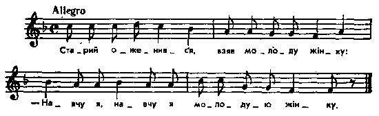 Старий оженився, взяв молоду жінку: – Навчу я, навчу я молодую жінку! Поїхала жінка до матері в гості. – Навчу я, навчу я молодую жінку! Тиждень минає, жінки немає, Другий минає, жінки немає, Третій минає, жінки немає, Четвертий іде – жінка їде. Старий ізлякався, в кропиву сховався, В кропиву сховався, бороною вкрився. Їднеє лихо, що борона коле, Другеє лихо, що кропива жалить, Третєє лихо – жінки боюся! – Навчу я, навчу я молодую жінку! Місце запису : с. Колодяжне коло м. Ковля на Волині Примітки Джерело : Леся Українка. Зібрання творів у 12 тт. – К. : Наукова думка, 1977 р., т. 9, с. 36 – 37. Фольклорні записи Перший | Попередній | Перелік | Наступний | Останній |