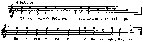 Ой ти, старий бобре, заховайся добре, бо я хорти маю, на поле пускаю. [Варіант з Дубенщини: Ой ти милий бобре, заховайся добре, бо я хорти маю, з лісу попускаю. Як випущу хорти, розірвуть до чорта. (Подав В. Боровик)] «Бібр» мусить сховатись, поки «мисливий» доспіває; часом «бібр» просить проспівати тричі або й більше, щоб мати час заховатись, то можна співати й більше, тільки «бібр» повинен просити, ще не починаючи ховатись. Проспівавши, скільки раз було вмовлено, «мисливий» гукає: «Хорти з лісу!». «Хорти» біжать на голос і шукають «бобра», коли той встиг сховатись, а знайшовши, ловлять його, бо він зараз кидається втікати, а коли він ще не встиг сховатись, то все одно за ним женуться, як тільки «мисливий» гукне. «Бібр» може і, втікаючи, ховатись по скілька разів, коли спритний, а «хорти» мусять його шукати. «Мисливий» сам не шукає і не ловить, тільки цькує, як бачить, що котре лінується: «Шукай, Сірко!» або «Лови, Бровко!», «Гуджа, хорти, гуджа його!». То знов завертає, як котре томиться: «На, сюди, Лиско! Не руш, Співко!» «Хорти», бігаючи, брешуть – «валують». Як хорти зловлять «бобра», то «мисливий» наміряється на нього кийком і кричить: «бабах!». «Бібр» падає додолу, «мисливий» гукає: «Хорти, в ліс!» і сам з ними біжить геть, а зостається «бібр» і той, хто перший торкнув його, ловлячи. «Бібр» стає за «мисливого», а той, хто зловив, за «бобра», і знов грають так само. Місце запису : с. Жабориця, коло Звягля Варіанти: 1) Свидницький. Великдень у Подолян. – Основа, 1861 p., № 11, ст. 37. 2) Moszyńśka. Kupajło i zabawy doroczne z okolic Białej Cerkwi. – Zbiór wiadomości do antropologii krajowej. Wydanie Akademii umiejętności w Krakowie, 1881, t. 5, s. 83 (Piżmurok). 3) Чубинский, т. 4, ст. 40. 4) Иванов, № 70. Примітки Джерело : Леся Українка. Зібрання творів у 12 тт. – К. : Наукова думка, 1977 р., т. 9, с. 104 – 106. Примітка К. Квітки (Народні мелодії. З голосу Лесі Українки. Записав і упорядкував Климент Квітка. – К. : 1918 р., ч. 2, с. 219) : «Бессараба. Херсон, № 29, 118, 119». Фольклорні записи Перший | Попередній | Перелік | Наступний | Останній |