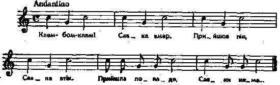 Клем-бом-клем! Савка вмер. Прийшов піп, Савка втік. Прийшла попадя, Савки нема... Часом се так собі співають, без гри. А часом одно з дітей удає «Савку» і лягає долі, як мертве, друге – «попа», трете – «попадю», і тоді так грають, як співають, що приходить «піп», а «Савка» втікає і ховається. «Піп» з «попадею» шукають «Савку», і котре знайде, то само стає за «Савку». Решта дітей з гурту не грає, тільки приспівує. Місце запису : с. Жабориця, коло Звягля Примітки Джерело : Леся Українка. Зібрання творів у 12 тт. – К. : Наукова думка, 1977 р., т. 9, с. 106. Примітка К. Квітки (Народні мелодії. З голосу Лесі Українки. Записав і упорядкував Климент Квітка. – К. : 1918 р., ч. 2, с. 219) : «На свідчення О. Пчілки пісні № 215, 216, 217 [дана пісня] співалися в Гадячому і відтіль внесені нею до родинного репертуару; в пам’яті ж Лесі Українки вони були злучені з Жаборицею, Звягельського пов., де вона пробувала в раннім дитинстві». Фольклорні записи Перший | Попередній | Перелік | Наступний | Останній |
