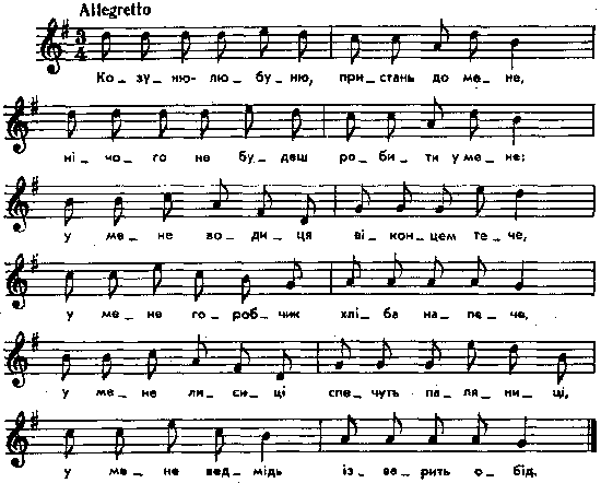 Козуню-любуню, пристань до мене, нічого не будеш робити в мене: у мене водиця віконцем тече, у мене горобчик хліба напече, у мене лисиці спечуть паляниці, у мене ведмідь ізварить обід. Місце запису : м. Миропілля, в Звягельщині Примітки Джерело : Леся Українка. Зібрання творів у 12 тт. – К. : Наукова думка, 1977 р., т. 9, с. 110. Фольклорні записи Перший | Попередній | Перелік | Наступний | Останній |