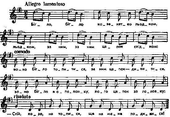 Бігло, бігло козенятко льодком, льодком, за ним, за ним цапок слідком; воно бігло топитися, за ним цапок – дивитися; воно бігло в ополонку, його цапок за головку: – Стій, козо, не топися, ще на мене подивися! Місце запису : м. Миропілля, в Звягельщині Варіант: Гринченко, 1899 г., т. 3, № 1365. Примітки Джерело : Леся Українка. Зібрання творів у 12 тт. – К. : Наукова думка, 1977 р., т. 9, с. 111. Примітка К. Квітки (Народні мелодії. З голосу Лесі Українки. Записав і упорядкував Климент Квітка. – К. : 1918 р., ч. 2, с. 216) : «Пор.: Чубинский, т. 5, с. 1153, № 153». Фольклорні записи Перший | Попередній | Перелік | Наступний | Останній |