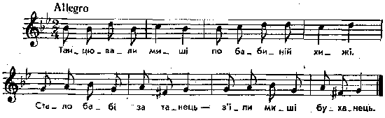 Танцювали миші по бабиній хижі. Стало бабі за танець – з’їли миші буханець. Місце запису : м. Миропілля, в Звягельщині Примітки Джерело : Леся Українка. Зібрання творів у 12 тт. – К. : Наукова думка, 1977 р., т. 9, с. 112. Фольклорні записи Перший | Попередній | Перелік | Наступний | Останній |