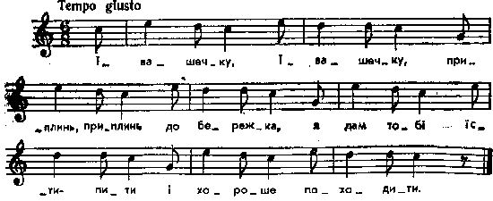Фольклорні записи Лесі Українки Дитячі гри, пісні й казки 14. Казка про Івашка (Сю казку мало котре з сільських дітей не знає; її навіть часом удають, мов гру: одне стає за «Івашка», друге за «відьму», а решта за «Оленку», за батька з матір’ю та за гусей, так кожне співає й проказує, як там за кого приходиться в казці.) Був собі чоловік та жінка, а в них синок – одиначок Івашко. Ото Івашко, як підріс трошки, став просити батька: – Зробіть мені, тату, човник та весельце, то я буду рибку ловити та вас обох при старощах годуватиму. – Куди тобі, синку, ти ще малий, – каже батько. А він таки в одно: – Зробіть та й зробіть. От зробив йому батько човна і весельце, і став Івашко рибалити. Поплине Івашко геть-геть річкою, а мати тим часом йому їсти наварить та в двойнятка накладе, візьме ті двойнятка ще й сорочечку білу для Івася, піде до берега, стане та й кличе: Івашечку, Івашечку, приплинь, приплинь до бережка, я дам тобі їсти-пити і хороше походити. А Івашко почує: – Це ж меї матінки голосок. Пливи, пливи, човнику, до бережка. Приплине, пообідає, сорочечку білу озьме, подякує, віддасть матері рибку, що наловив, та й знов на річку. Нагледіла Івашка відьма та й каже собі: – Ото б добре Івашкового м’ясця попоїсти! Дай-но я його підманю. Стала в обідню годину на бережку та й кличе: