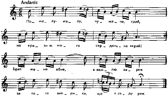 Помалу-малу, чумаче, грай, не врази ж мого серденька вкрай! Брат мене вбив, в землю зарив за того веприка, що в саду рив. Злякався чумак, хотів ту сопілку викинути, а товариші кажуть: – Не кидай, треба людей попитати, може, хто скаже, проти чого воно. Доїхали до села, до крайньої хати, поспросились на ніч, там їх прийняли, ще й вечеряти запросили. Сидять вони, вечеряють та про те диво розказують, що яка то дивна у них сопілка з теї калини, що росте при дорозі: – Ось нате, господарю, хоч самі заграйте. Узяв старий господар сопілку, заграв, а вона до нього людським голосом співає, словами промовляє: Помалу-малу, батеньку, грай, не врази ж мого серденька вкрай! Брат мене вбив, в землю зарив за того веприка, що в саду рив. – Що воно таке? – каже господар. – Ану-но ще ти, стара, заграй! Узяла стара господиня сопілку, а вона й до неї: Помалу-малу, матінко, грай, не врази ж мого серденька вкрай! Брат мене вбив, в землю зарив за того веприка, що в саду рив. Тоді старий до сина: – Тепер ти грай. Той не хоче: – Чи я малий у дудочку грати? Та батько таки примусив. Тільки то молодий господар сопілку до губи притулив, а вона як заквилить: Помалу-малу, братику, грай, не врази ж мого серденька вкрай! Ти ж мене вбив, в землю зарив за того веприка, що в саду рив. Тут батько до сина: – Признавайся, що ти брата вбив! Той і признався, бо вже не було куди. Прогнав його батько геть з очей, а сам зостався з старою сиротами віку доживати.