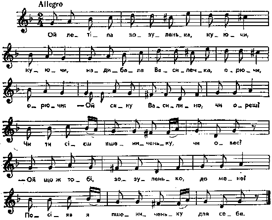 Ой летіла зозуленька, куючи, куючи, надибала Василечка, орючи, орючи: – Ой сину Василино, чи ореш? Чи ти сієш пшениченьку, чи овес? – Ой що ж тобі, зозуленько, до мене? Посіяв я пшениченьку для себе. Примітки Джерело : Леся Українка. Зібрання творів у 12 тт. – К. : Наукова думка, 1977 р., т. 9, с. 124 – 125. Вперше опубліковано : Народні мелодії. З голосу Лесі Українки. Записав і упорядкував Климент Квітка. – К. : 1918 р., ч. 2, с. 188. Примітки К.Квітки : Інші мелодії: Народные украинские напевы, положенные для фортепиано Николаем Маркевичем. Москва, 1840, № 5; Kolberg. Pokucie, t. 3, № 196; парал. тексти без нот: Метлинский, 119; Головацкий, т. 2, с. 204, № 39, с. 841, № 15; де Воллан, с. 199. Фольклорні записи Перший | Попередній | Перелік | Наступний | Останній |