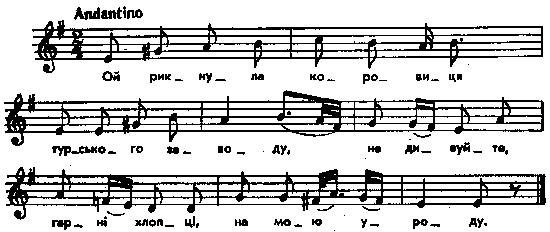 Ой рикнула коровиця турського заводу, не дивуйте, гарні хлопці, на мою уроду. Ой не ходи коло води, шудратий Мартине, не грай, не грай в сопілочку, нехай вона згине. Ой бо тая сопілочка тоненько заводить, не одную дівчиноньку йа з розуму зводить. Примітки Джерело : Леся Українка. Зібрання творів у 12 тт. – К. : Наукова думка, 1977 р., т. 9, с. 127. Вперше опубліковано : Народні мелодії. З голосу Лесі Українки. Записав і упорядкував Климент Квітка. – К. : 1918 р., ч. 2, с. 190 – 191. Порівняно з текстом в автографі Лесі Українки (див. стор. 127 цього тому) у кн. К. Квітки є ще такі рядки: Погоріли болота, зосталися купи; женітеся парубочки, аби не рекрути. Коб не гори високії та не перелази, то бігав би до дівчини на день по три рази. (Пор. № 14 і 15 цього збірника). Примітки К.Квітки : Парал. тексти: до 1-ої строфи – Янчук. Седлец, № 192; Бигдай, № 261; Kolberg. Wolyn, № 141 (всі три з іншими мелодіями); Гнатюк. Коломийки, № 5951, 6328; до 3-ої – Милорадович, с. 100, № 29. Фольклорні записи Перший | Попередній | Перелік | Наступний | Останній |