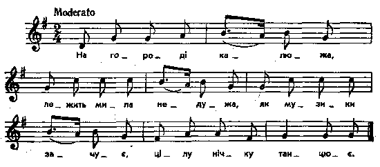 На городі калюжа, лежить мила недужа, як музики зачує, цілу нічку танцює. Примітки Джерело : Леся Українка. Зібрання творів у 12 тт. – К. : Наукова думка, 1977 р., т. 9, с. 129. Вперше опубліковано : Народні мелодії. З голосу Лесі Українки. Записав і упорядкував Климент Квітка. – К. : 1918 р., ч. 2, с. 193. Примітки К.Квітки : Інша мелодія: Lipinski, № 58. Парал. тексти без нот: Чубинский, т. 5, № 107, с. 1138, № 159, с. 1155; де Воллан, с. 199, № 81; Rokossowska, № 202, s. 235; Kolberg. Pokucie, t. 3, № 590; Шухевич, т. 3, с. 127, № 104; Гнедич, № 762. Фольклорні записи Перший | Попередній | Перелік | Наступний | Останній |