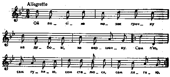 Ой посіяв козак гречку на дубові, на вершечку. Сам п’ю, сам гуляю, сам стелюся, сам лягаю. [Два останніх рядки співаються двічі] Схватилася шура-бура, козакові гречку здула. Сам п’ю, сам гуляю, сам стелюся, сам лягаю. Примітки Джерело : Леся Українка. Зібрання творів у 12 тт. – К. : Наукова думка, 1977 р., т. 9, с. 134. Вперше опубліковано : Народні мелодії. З голосу Лесі Українки. Записав і упорядкував Климент Квітка. – К. : 1918 р., ч. 2, с. 198. Примітки К.Квітки : Пор.: Головацкий, т. 2, с. 201, № 30; Popowski, № 111; Чубинский, т. 5, с. 1170, № 210; 3 фольклорних занять Маркіана Шашкевича. Подав М. Возняк. – «Зап. Наук. тов. ім. Шевченка», 1912, кн. 3, с. 152. Фольклорні записи Перший | Попередній | Перелік | Наступний | Останній |