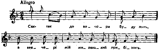 Сяк-так до вечора буду жить, а ввечері мій миленький прибіжить. Прибігає мій миленький уночі, а я лежу, молодая, на печі. – Ой чого ти, моя мила, так лежиш, ой чого ти на вулицю не біжиш? – Якби мені такі-сякі шкарбунці, не сиділа ж би я вдома на печі. Примітки Джерело : Леся Українка. Зібрання творів у 12 тт. – К. : Наукова думка, 1977 р., т. 9, с. 136. Вперше опубліковано : Народні мелодії. З голосу Лесі Українки. Записав і упорядкував Климент Квітка. – К. : 1918 р., ч. 2, с. 200. Примітки К.Квітки : Парал. тексти без нот: Чубинский, т. 5, № 224, с. 105, № 191, с. 1165; Гнедич, № 1024. Фольклорні записи Перший | Попередній | Перелік | Наступний | Останній |