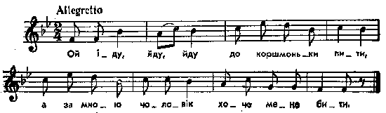 Ой іду, йду, йду до коршмоньки пити, а за мною чоловік, хоче мене бити. Примітки Джерело : Леся Українка. Зібрання творів у 12 тт. – К. : Наукова думка, 1977 р., т. 9, с. 137 – 138. Вперше опубліковано : Народні мелодії. З голосу Лесі Українки. Записав і упорядкував Климент Квітка. – К. : 1918 р., ч. 2, с. 202. Фольклорні записи Перший | Попередній | Перелік | Наступний | Останній |