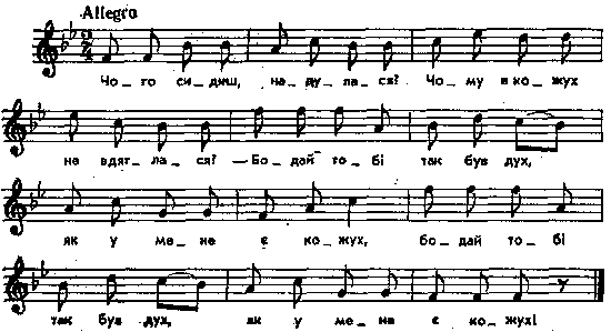 – Чого сидиш, надулася? Чому в кожух не вдяглася? – Бодай тобі так був дух, Як у мене є кожух! (2:2) Примітки Джерело : Леся Українка. Зібрання творів у 12 тт. – К. : Наукова думка, 1977 р., т. 9, с. 138. Вперше опубліковано : Народні мелодії. З голосу Лесі Українки. Записав і упорядкував Климент Квітка. – К. : 1918 р., ч. 2, с. 203. Примітки К.Квітки : Інші мелодії у Лисенка, VI, № 19; Ходоровский, № 11; Конощенко, т. 3, № 69. Фольклорні записи Перший | Попередній | Перелік | Наступний | Останній |