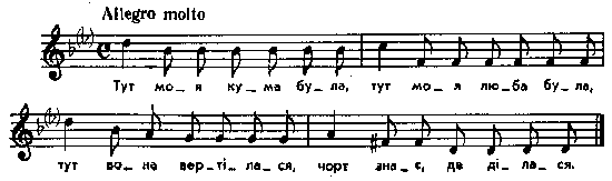 Тут моя кума була, тут моя люба була, тут вона вертілася, чорт знає, де ділася. Примітки Джерело : Леся Українка. Зібрання творів у 12 тт. – К. : Наукова думка, 1977 р., т. 9, с. 140 – 141. Вперше опубліковано : Народні мелодії. З голосу Лесі Українки. Записав і упорядкував Климент Квітка. – К. : 1918 р., ч. 2, с. 205 – 206. Примітки К.Квітки : Інша мелодія: Колесса. Ходовичі, с. 77. Фольклорні записи Перший | Попередній | Перелік | Наступний | Останній |