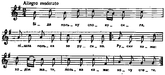 Біда польку спокусила, пішла полька за русина. Русин каже: ходім жати, полька каже: хочу спати. Русин каже: ходім в поле, полька каже: колька коле. Примітки Джерело : Леся Українка. Зібрання творів у 12 тт. – К. : Наукова думка, 1977 р., т. 9, с. 144 – 145. Фольклорні записи Перший | Попередній | Перелік | Наступний | Останній |