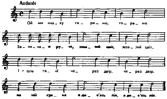 Ой ми нивку горемо, горемо. Зеленая рута, жовтий цвіт, жовтий цвіт. Ішла пані через двір, через двір, На ній сукня в дев’ять піл, в дев’ять піл. Місце запису : Миропілля. Звягель Примітки Джерело : Леся Українка. Зібрання творів у 12 тт. – К. : Наукова думка, 1977 р., т. 9, с. 170. У варіанті мелодії з рукопису Лесі Українки – у третьому такті замість стрибка на кварту – секунда і терція; у п’ятому такті замість кінцевої кварти – терція. Майже ідентична мелодія у запису К. Квітки. Фольклорні записи Перший | Попередній | Перелік | Наступний | Останній |