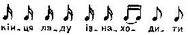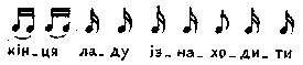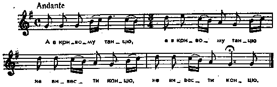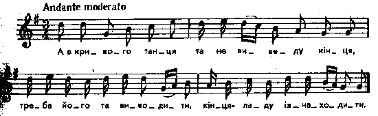 А в кривому танцю, А в кривому танцю Не вивести концю, Не вивести концю. Місце запису : с. Колодяжне Примітки Джерело : Леся Українка. Зібрання творів у 12 тт. – К. : Наукова думка, 1977 р., т. 9, с. 173 – 174. Вар. А. В порівнянні з записом Лесі Українки у Лисенка існують незначні відміни в мелодичному контурі першого такту. Замість мелодично подрібненої четвертої ноти у першому такті тут нерозспіваний склад і досить суттєві відміни в розспіві слів четвертого такту, де акцентація слів, у порівнянні з записом Л. Українки, трохи штучна: У М. Лисенка: