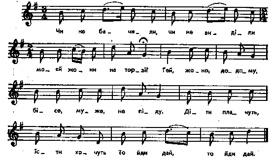 Чи не бачили, чи не виділи моєй жони на торзі? Гей, жоно, додому. Бiсе, муже, не піду. Діти плачуть, Їсти хочуть. То йди дай, то йди дай. Місце запису : не вказане Примітки Джерело : Леся Українка. Зібрання творів у 12 тт. – К. : Наукова думка, 1977 р., т. 9, с. 174. Пісня дається без зазначення місцевості. В порівнянні з записом Лесі Українки у Лисенка коротший варіант пісні, деякі розходження у комбінації мотивів. Пор. також із записом К. Квітки. Фольклорні записи Перший | Попередній | Перелік | Наступний | Останній |
