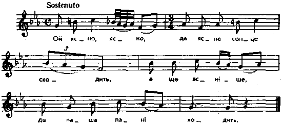 Ой ясно, ясно, де ясне сонце сходить, а ще ясніше, де наша пані ходить. Місце запису : Колодяжне Примітки Джерело : Леся Українка. Зібрання творів у 12 тт. – К. : Наукова думка, 1977 р., т. 9, с. 178. В порівнянні з записом Лесі Українкиу М. Лисенка в другому такті замість ноти соль нота фа та підвищений четвертий ступінь, у п’ятому такті другий склад не розспіваний. Фольклорні записи Перший | Попередній | Перелік | Наступний | Останній |