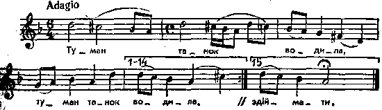 Туман танок водила, – (2) що виведе, то й стане, на дівочок погляне, чи всі дівки в танку є. Усі дівки в танку є, тільки нема їдної – Настусі молодої, її мати чесала, а чешучи, навчала: «Не стій, донько, з нелюбом, не дай ручки стискати, перстеника здіймати, а як стаєш з миленьким, давай ручку стискати, перстеника здіймати». Слова «туман» в сьому варіанті стоїть намість давнього слова «тума», котре значить: людина мішаної породи, – один з родителів турчин або татарин, а другий українець (див. Словар укр. мови Б. Грінченка). В двох інших варіантах (Метлинский, с. 299; Эварницкий, № 42) – «тума» стоїть в центрі змісту пісні. З усіх трьох варіантів дається зробити така реконструкція первісного тексту: Тума танок водила, що виведе, то й стане, на дівочок погляне, чи всі дівки в таночку. – Всі дівочки в таночку, лиш роженьки немає. Мати роженьку чесала, а чешучи, навчала: «Доню моя, роженько, як ти підеш у танок, не становись край туми, – тума зведе з розуму, на ніженьку наступить, за рученьку іздавить, золот перстень іздойме». Варіанти мелодії: з подібним текстом у Лисенка, Молодощі, с. 28 (= «2-й вінок веснянок», ст. 8); з іншим текстом: Сокальский, № 4, II. Паралельні тексти без нот, окрім вищезгаданих, ще Чубинский, 1, ст. 36, Головацкий, ч. 3, т. 1, с. 92, і Милорадович, с. 49 і 50. Місце запису : Миропілля, Звягельського повіту Примітки Джерело : Леся Українка. Зібрання творів у 12 тт. – К. : Наукова думка, 1977 р., т. 9, с. 185 – 187. Вперше опубліковано : Народні мелодії. З голосу Лесі Українки. Записав і упорядкував Климент Квітка. – К. : 1917 р., ч. 1, с. 8. У рукописному зошиті Лесі Українки та ж мелодія у тональності мі бемоль мінор з позначенням темпу lentissimo un poco piu menolento в такті 4/4 і 2/4 з незначними інтонаційними відмінами. Пісню міг перейняти від Л. Українки М. Лисенко. Майже аналогічну див.: Лисенко. Зібрання творів, с. 41. Фольклорні записи Перший | Попередній | Перелік | Наступний | Останній |