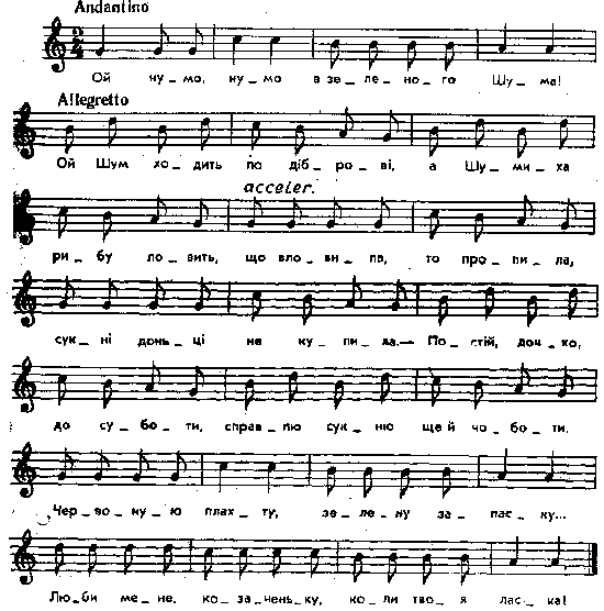 Ой нумо, нумо в зеленого Шума! Ой Шум ходить по діброві, а Шумиха рибу ловить, що вловила, то пропила, сукні доньці не купила. – Постій, дочко, до суботи, справлю сукню ще й чоботи. Червоную плахту, зелену запаску... Люби мене, козаченьку, коли твоя ласка! Варіанти мелодії і тексту: Чубинский, т. 3, с. 50 (=Рубец216, № 28; Молодощі – та сама мелодія, що у Рубця, доповнена заспівом). Пор. Конощенко 1902, II сотня, № 20, і Рубец100, № 94. Парал. тексти без нот: Максимович. Дни, с. 17; Шейковский, с. 21, № 9; Гринченко, 1899, т. 3, № 197; Эварницкий, № 56; Бессараба. Херсон, текст № 18. Місце запису : Миропілля, Звягельського повіту Примітки Джерело : Леся Українка. Зібрання творів у 12 тт. – К. : Наукова думка, 1977 р., т. 9, с. 189 – 190. Вперше опубліковано : Народні мелодії. З голосу Лесі Українки. Записав і упорядкував Климент Квітка. – К. : 1917 р., ч. 1, с. 13 – 14. Фольклорні записи Перший | Попередній | Перелік | Наступний | Останній |