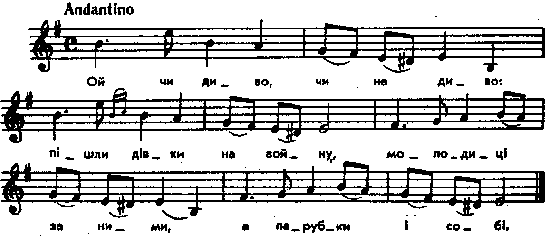 Ой чи диво, чи не диво: пішли дівки на войну, молодиці за ними, а парубки і собі. Пор. № 8 сього збірника. Місце запису : с.Чекна, Дубенського повіту Примітки Джерело : Леся Українка. Зібрання творів у 12 тт. – К. : Наукова думка, 1977 р., т. 9, с. 194. Вперше опубліковано : Народні мелодії. З голосу Лесі Українки. Записав і упорядкував Климент Квітка. – К. : 1917 р., ч. 1, с. 19 – 20. Запис Квітки відрізняється від запису Лесі Українки розлогим мелодичним контуром і розширеною формою строфи. Фольклорні записи Перший | Попередній | Перелік | Наступний | Останній |