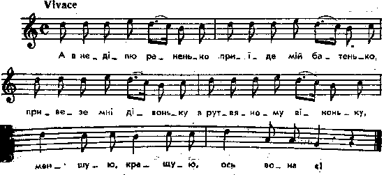 А в неділю раненько приїде мій батенько, привезе мнї дівоньку в рутвяному віноньку – меншую, кращую, ось вона є! Місце запису : с.Чекна, Дубенського повіту Примітки Джерело : Леся Українка. Зібрання творів у 12 тт. – К. : Наукова думка, 1977 р., т. 9, с. 202 – 203. Вперше опубліковано : Народні мелодії. З голосу Лесі Українки. Записав і упорядкував Климент Квітка. – К. : 1917 р., ч. 1, с. 31. Пісню записав від Лесі Українки М. Лисенко в тональності фа мажор із збереженням волинської вимови в тексті. Фольклорні записи Перший | Попередній | Перелік | Наступний | Останній |