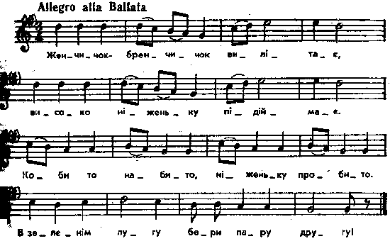 Женчичок-бренчичок вилітає, високо ніженьку підіймає. Коби то набито, ніженьку пробито. В зеленім лугу, бери пару другу! Місце запису : с.Чекна, Дубенського повіту Примітки Джерело : Леся Українка. Зібрання творів у 12 тт. – К. : Наукова думка, 1977 р., т. 9, с. 203. Вперше опубліковано : Народні мелодії. З голосу Лесі Українки. Записав і упорядкував Климент Квітка. – К. : 1917 р., ч. 1, с. 32 – 33. Той же зразок мелодії у відмінному тактуванні (на 3/4) див. у запису Лисенка, а також у виданні: Лисенко. Зібрання творів, с. 79, разом а описом гри. Фольклорні записи Перший | Попередній | Перелік | Наступний | Останній |