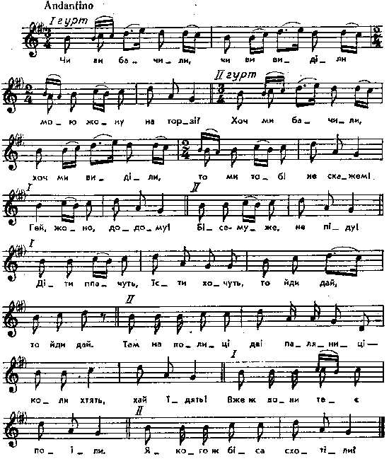Перший хор Чи ви бачили, чи ви виділи мою жону на торзі? Другий хор Хоч ми бачили, хоч ми виділи, то ми тобі не скажем! 1 Гей, жоно, додому! 2 Бісе-муже, не піду! 1 Діти плачуть, їсти хочуть, то йди дай, то йди дай. 2 Там на полиці дві паляниці, коли хтять, хай їдять! 1 Вже ж вони теє поїли. 2 Якого ж біса схотіли? Інші мелодії: Kolberg. Pokucie, t. І, s. 168. Kolberg. Wolyn, № 366. Гнатюк. Гаївки, № 22, 23, 78, 79, 87, 88, 171. Роздольський, 179 і 180. Тексти: Гнатюк. Гаївки, с. 81 – 87. Місце запису : с.Чекна, Дубенського повіту Примітки Джерело : Леся Українка. Зібрання творів у 12 тт. – К. : Наукова думка, 1977 р., т. 9, с. 204 – 205. Вперше опубліковано : Народні мелодії. З голосу Лесі Українки. Записав і упорядкував Климент Квітка. – К. : 1917 р., ч. 1, с. 34 – 35. Пісню з мелодією записала Леся Українка та М.Лисенко від Лесі Українки. Пісня – дуже цікавий зразок для простеження варіантної змінності тексту в ігрових піснях. Фольклорні записи Перший | Попередній | Перелік | Наступний | Останній |