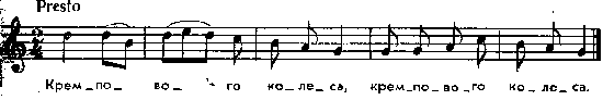 Кремпового колеса, згубив Тиміш пояса, а Марина ридала, поясини шукала. [Кожен рядок співається двічі. – Ред.] Інша мелодія, теж із Колодяжного, і повніший текст – Лисенко. Шкільна збірка, с. 4. «Кремповеє колесо» – очевидно, замість «кроковеє» (жовте, шафранне, пор. «крокіс»). «Кроковеє колесо» – сонце (Потебня, с. 153 і далі). Очевидно, в Колодяжнім «кр[емповеє] колесо» – тільки ремінісценція, захована бурлескою. Потебня приводить таку танкову пісню з Роменського повіту: Кроковеє колесо вище тину стояло, много дива видало. Чи бачило, колесо, куди милий поїхав? – За ним трава зелена і діброва весела. Кроковеє колесо вище тину стояло, много дива видало. Чи бачило, колесо, куди нелюб поїхав? – За ним трава полягла і діброва загула. Місце запису : с.Колодяжне, Ковельського повіту Примітки Джерело : Леся Українка. Зібрання творів у 12 тт. – К. : Наукова думка, 1977 р., т. 9, с. 205 – 206. Вперше опубліковано : Народні мелодії. З голосу Лесі Українки. Записав і упорядкував Климент Квітка. – К. : 1917 р., ч. 1, с. 35 – 36. Пісню без мелодії записала Леся Українка у розділі веснянок. Подібна мелодія у М. Лисенка з цими ж словами.. Мелодію М. Лисенко опублікував також у збірці 1908 р. (Див.: Лисенко. Зібрання творів, с. 77) з таким варіантом тексту: «Співає увесь гурт, взявшись за руки в коло й водячи хоровод. Кремповеє колесо, колесо Вище тину стояло, стояло. Вище тину стояло, стояло, Много дива видало, видало: Що в решеті водиці, водиці, Стільки в хлопців правдиці, правдиці. Скільки в небі зірочок, зірочок, Стільки хлопцям болячок, болячок. Кремпового колеса, колеса, Згубив Іван пояса, пояса. А Маруся ридала, ридала, Поясини шукала, шукала». Фольклорні записи Перший | Попередній | Перелік | Наступний | Останній |