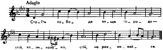 Стоїть лобода вище города – стій, калинонько, стій, не розвивайся. Повний текст Л[еся] У[країнка] опублікувала в своїм артиклі: «Купала на Волині» («Жите і слово» за 1894 рік, кн. II i III, вид. у Львові). Ця публікація стала мені відома вже після смерті Л. У.; диктуючи мені тексти, вона про ті свої давні записи не згадала. З приміток редакції «Житя і слова» знати, що Л. прислала тоді до редакції также і свої записи мелодій купалових пісень, і редакція мала замір їх надрукувати, але того не зробила. Чи ті записи де заховалися, невідомо. Місце запису : Миропілля, Звягельського повіту Примітки Джерело : Леся Українка. Зібрання творів у 12 тт. – К. : Наукова думка, 1977 р., т. 9, с. 209. Опубліковано : Народні мелодії. З голосу Лесі Українки. Записав і упорядкував Климент Квітка. – К. : 1917 р., ч. 1, с. 40 – 41. Фольклорні записи Перший | Попередній | Перелік | Наступний | Останній |