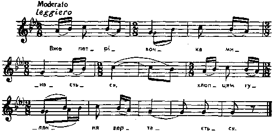 Вже петрівочка минається, хлопцям гуляння вертається. Ідіте, хлопці, погуляйте, дівчат на вісінь підмовляйте! Повніший текст з с. Рокити, Ковельського повіту, в «Житі і слові» за 1894 р., ст. 282. Місце запису : з Колодяжного, Ковельського повіту Примітки Джерело : Леся Українка. Зібрання творів у 12 тт. – К. : Наукова думка, 1977 р., т. 9, с. 212. Опубліковано : Народні мелодії. З голосу Лесі Українки. Записав і упорядкував Климент Квітка. – К. : 1917 р., ч. 1, с. 43. Пісню з незначними інтонаційними відмінами та іншим тактуванням записала Леся Українка. Фольклорні записи Перший | Попередній | Перелік | Наступний | Останній |