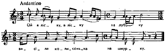 Ой в ліску, в ліску на дубку висіла колисонька на шнурку. В тій колисоньці Петруньо, а коло його татко його. – Шибай мене, татойко, високо, нехай я зобачу далеко. Там десь моя дівойка гуляє, шитим рукавцем махає. Далекий варіант мелодії: Балліна, № 49. Ближчий: Zb. wiad., t. 8, № 100, s. 153. Тексти показані в «Житі і слові» за 1894 рік. В записові, опублікованім Лесею в «Житі і слові», є одміни проти уміщеного тут, і місцем запису зазначене Миропілля. Очевидно, Леся продиктувала мені колодяженський варіант, який перейняла після 1894 року. В цім варіанті оригінальне «шибай» намість ординарного «гойдайте» миропільського варіанта. – Пор.: Шейн, № 340. Місце запису : з Колодяжного, Ковельського повіту Примітки Джерело : Леся Українка. Зібрання творів у 12 тт. – К. : Наукова думка, 1977 р., т. 9, с. 212 – 213. Вперше опубліковано : Народні мелодії. З голосу Лесі Українки. Записав і упорядкував Климент Квітка. – К. : 1917 р., ч. 1, с. 44. Фольклорні записи Перший | Попередній | Перелік | Наступний | Останній |