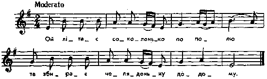 Ой літає соколонько по полю та збирає челядоньку додому. Іди, іди, челядонько, додому, вигуляла все літечко по полю. Вигуляла все літечко ще й жнива, – заболіла голівонька ще й спина. Вар. тексту: Чубинский, т. 3, жн[иварська], № 52; Гильтебрандт, вып. І, 155, з Берестейського повіту. У Гільтебрандта повні, прекрасні тексти жниварських пісень. Місце запису : с. Колодяжне Ковельського повіту Примітки Джерело : Леся Українка. Зібрання творів у 12 тт. – К. : Наукова думка, 1977 р., т. 9, с. 216. Вперше опубліковано : Народні мелодії. З голосу Лесі Українки. Записав і упорядкував Климент Квітка. – К. : 1917 р., ч. 1, с. 47. У порівнянні з варіантом пісні, який Леся Українка проспівала М. Лисенкові, запис К. Квітки має гостріші динамічні контрасти через подрібнення тону на третьому складі (2-й такт), розспіваний другий склад (3-й такт). Фольклорні записи Перший | Попередній | Перелік | Наступний | Останній |