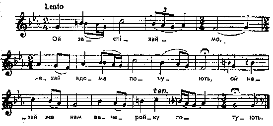 Ой заспіваймо, нехай вдома почують, ой нехай же нам вечеройку готують. Місце запису : с. Колодяжне Ковельського повіту Примітки Джерело : Леся Українка. Зібрання творів у 12 тт. – К. : Наукова думка, 1977 р., т. 9, с. 219. Вперше опубліковано : Народні мелодії. З голосу Лесі Українки. Записав і упорядкував Климент Квітка. – К. : 1917 р., ч. 1, с. 50. Фольклорні записи Перший | Попередній | Перелік | Наступний | Останній |