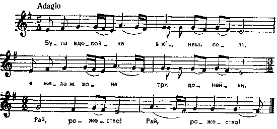 Була вдовойка в кінець села, а мала ж вона три донейки. Рай, poжество! Рай, рожество! Їдна донейка йа Марусейка, Друга донейка йа Ганнусейка. Рай, рожество! Рай, рожество! Повний текст, записаний Оленою Пчілкою, – в додатку до артикля Лесі Українки «Купала на Волині» («Житє і слово» за 1894 рік, стор. 280). О. Пч[ілка], ознайомившися з моїм записом в 1917 році, засвідчила, що тая колядка співалася, власне, на цей голос. Колядка на тему: дівчина-воячка. Див.: Ів. Франко. Студії над укр. нар. піснями. Записки Наук, товариства ім. Шевченка. Місце запису : з сіл Ратного і Рокитниці, Ковельського повіту Примітки Джерело : Леся Українка. Зібрання творів у 12 тт. – К. : Наукова думка, 1977 р., т. 9, с. 223 – 224. Вперше опубліковано : Народні мелодії. З голосу Лесі Українки. Записав і упорядкував Климент Квітка. – К. : 1917 р., ч. 1, с. 54. Повний текст див. у запису Олени Пчілки із села Рокитниці («Жите і слово», 1894, № 1, стор. 280). В примітці до цієї колядки Олена Пчілка звертає увагу на подібність її вмісту з номером 13 купальських пісень, записаних Лесею Українкою на Волині і надрукованих перед цією колядкою в тій же книзі журналу «Жите і слово». Фольклорні записи Перший | Попередній | Перелік | Наступний | Останній |