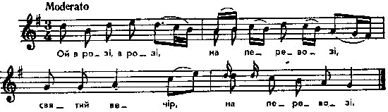 Ой в розі, в розі, на перевозі, святий вечір, на перевозі. Гречная панна перевіз держала святий вечір, перевіз держала. Вар. мелодії: Kolberg. Wolyn, № 148. Тексти: Метлинский, с. 333; Чубинский, т. 3, колядки № 43 і 45. Див.: Потебня, т. 2, с. 449. Місце запису : з Колодяжного, Ковельського повіту Примітки Джерело : Леся Українка. Зібрання творів у 12 тт. – К. : Наукова думка, 1977 р., т. 9, с. 224. Вперше опубліковано : Народні мелодії. З голосу Лесі Українки. Записав і упорядкував Климент Квітка. – К. : 1917 р., ч. 1, с. 54. Всі колядки про дівчину-перевізницю мають однаковий зміст: дівчина мудро відповідає на вигадки хлопця про диво дивнеє (див.: Колядки і щедрівки. К., «Наукова думка», 1965, стор. 384). Фольклорні записи Перший | Попередній | Перелік | Наступний | Останній |