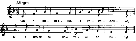 Ой а колодко, йа колодойко, ой а що ж ти нам та й наробила! Ой а що ж ти нам та наробила, – що серед будня свято зробила! В Галичині на подібну мелодію співають колядок. Див. збірники Колесса. Ходовичі, № 5, с. З, № 8, с. 7; Роздольський, № 145 – 147. Місце запису : не вказане Примітки Джерело : Леся Українка. Зібрання творів у 12 тт. – К. : Наукова думка, 1977 р., т. 9, с. 231. Вперше опубліковано : Народні мелодії. З голосу Лесі Українки. Записав і упорядкував Климент Квітка. – К. : 1917 р., ч. 1, с. 58 – 59. Фольклорні записи Перший | Попередній | Перелік | Наступний | Останній |