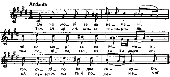 Ой на морі та на камені, Там сиділи, стиха говорили, Ой на морі та на камені, Там сиділи, стиха говорили. там сиділо йа два голуби ой куди ж ми та й полинемо ? Ця мелодія служить і до дальших моментів весільного ритуалу, пристосована до різних слів, напр.: