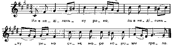 Йа в неділеньку рано, Йа в неділеньку рано, синє море хоpoше грало. Варіанти мелодії: Чубинский, т. 4, № 89; Kolberg. Pokucie, t. 1, № 209 (віддалений – Kolberg. Wolyn, № 103, 129); Лисенко. Українські обрядові пісні, 5, № 20; Демченко, № l, 59, 75; Конощенко, т. 3, № 96; Роздольський, № 57 – 58; Остапович, т. 4, № 1, 3, 8; Верховинець, № 19, 75, 83, с. 29 і далі. Тексти : Lozinski, s. 115; Zegota-Pauli, t. 1, s. 108, № 11; Головацкий, т. 2, с. 659, 92; т. 3, ч. 2, с. 229, № 24; с. 284, № 6; с. 316, № 11; с. 336, № 8; с. 367, № 56. Див.: Потебня, т. 1, с. 191 і далі; Waclaw z Oleska, s. 9, № 24; s. 31, № 101. Місце запису : Миропілля Примітки Джерело : Леся Українка. Зібрання творів у 12 тт. – К. : Наукова думка, 1977 р., т. 9, с. 234 – 235. Вперше опубліковано : Народні мелодії. З голосу Лесі Українки. Записав і упорядкував Климент Квітка. – К. : 1917 р., ч. 1, с. 61. Там же варіант «Йа в неділеньку рано». Пісня співається на заручинах. Фольклорні записи Перший | Попередній | Перелік | Наступний | Останній |