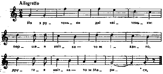 Йа з pyтоньки дві квітоньки: Першая квітка – тож Іванко, Другая квітка – то ж Марися. Місце запису : Миропілля Примітки Джерело : Леся Українка. Зібрання творів у 12 тт. – К. : Наукова думка, 1977 р., т. 9, с. 237. Вперше опубліковано : Народні мелодії. З голосу Лесі Українки. Записав і упорядкував Климент Квітка. – К. : 1917 р., ч. 1, с. 63. Фольклорні записи Перший | Попередній | Перелік | Наступний | Останній |