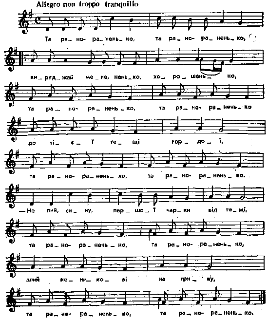 Та рано-раненько, та рано-раненько виряджай мене, ненько, хорошенько, та рано-раненько, та рано-раненько до тієї тещі гордої, та рано-раненько, та рано-раненько. – Не пий, сину, першої чарки від тещі, та рано-раненько, та рано-раненько, злий коникові на гриву, та рано-раненько, та рано-раненько. Парал. тексти без нот: Г. Ткачев. Этнографические очерки Богучарского уезда. Памятная книжка Воронежской губ. на 1865 и 1866 годы. Воронеж, 1867, ст. 202; Stecki, t. I, s. 79; Гр. Купчанко. Песни буковинского народа. – Записки юго-западного отдела имп. русского Географического общества, т. 2, К., 1875, № 205; Труды общества иссл. Волыни, т. 1, с. 137, № 51; Эварницкий, № 555. Місце запису : Миропілля Примітки Джерело : Леся Українка. Зібрання творів у 12 тт. – К. : Наукова думка, 1977 р., т. 9, с. 240 – 241. Вперше опубліковано : Народні мелодії. З голосу Лесі Українки. Записав і упорядкував Климент Квітка. – К. : 1917 р., ч. 1, с. 66. Співають світилки, коли мати виряджає в неділю молодого до тещі. Фольклорні записи Перший | Попередній | Перелік | Наступний | Останній |