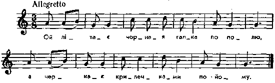 Ой літає чорная галка по полю, а черкає крилечками по йому. Мел. пор.: Роздольський, № 61, 114 – 123; Kolberg. Wolyn, № 125 (весільна), 146 (щедрівка). Місце запису : Миропілля Примітки Джерело : Леся Українка. Зібрання творів у 12 тт. – К. : Наукова думка, 1977 р., т. 9, с. 246. Вперше опубліковано : Народні мелодії. З голосу Лесі Українки. Записав і упорядкував Климент Квітка. – К. : 1917 р., ч. 1, с. 69. Фольклорні записи Перший | Попередній | Перелік | Наступний | Останній |