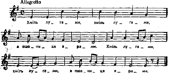 Хміль лугами, хміль лугами, а пшениця ярами. Ходи, ходи, молода Ганнусю, повечеряймо з нами. Хміль не в’ється, хміль не в’ється, а пшениця не жнеться. А вже ж мені, мої подруженьки, дівування минеться. Інша мелодія у Верховинець, № 88-б; ближча у Демченко, № 114. Парал. текст: Stecki, t. 1, s. 88. Місце запису : Миропілля Примітки Джерело : Леся Українка. Зібрання творів у 12 тт. – К. : Наукова думка, 1977 р., т. 9, с. 246. Вперше опубліковано : Народні мелодії. З голосу Лесі Українки. Записав і упорядкував Климент Квітка. – К. : 1917 р., ч. 1, с. 69 – 70. Співають у суботу в молодої перед розплітанням коси. Фольклорні записи Перший | Попередній | Перелік | Наступний | Останній |