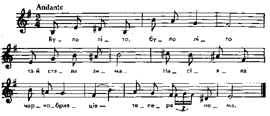 Було літо, було літо та й стала зима... Насіяла чорнобривців – тепера нема. А вже ж мої чорнобривці процвітають, а вже ж мою русу косу розплітають. – Чи ж я тобі, моя доню, не казала, чи твоєму та серденьку не сприяла: ой не ходи та до броду рано по воду та не слухай голубоньків, де два загудуть. Та не слухай голубоньків, де два загудуть, та не бери подарочків, що дарма дають. Тебе ж тії подарочки з розуму зведуть, од матінки до свекрухи приведуть. Варіанти мелодії: Роздольський, № 63, 83, 84, 90; Конощенко, т. 3, № 93; Верховинець, № 24, 72, 86, с. 31 і далі. Зріднені мелодії : Рубец216, № 57; Чубинский, т. 4, № 77, 78, 29 і інші; Лисенко, Весільні пісні, № 25; Бигдай, т. 1, № 22; Kolberg. Wolyn, № 110 і 161; Конощенко, т. 2, № 95 – ритмічний розвиток тої ж основи – на ямби. Парал. текст: Памятная книжка Воронежской губ. на 1892 г., вып. 2, стор. 291. Місце запису : Миропілля Примітки Джерело : Леся Українка. Зібрання творів у 12 тт. – К. : Наукова думка, 1977 р., т. 9, с. 247. Вперше опубліковано : Народні мелодії. З голосу Лесі Українки. Записав і упорядкував Климент Квітка. – К. : 1917 р., ч. 1, с. 70 – 71. Співають дружки, розплітаючи косу. Фольклорні записи Перший | Попередній | Перелік | Наступний | Останній |