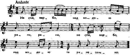 Не стій, вербо, над водою рано, рано! Не стій, вербо, над водою та ранесенько! Розвий, вербо, сімсот квіток рано, рано! Розвий, вербо, сімсот квіток та ранесенько! Що всім хлопцям по квітоньці рано, рано! Що всім хлопцям по квітоньці та ранесенько! Тільки Грицеві нема квітки рано, рано! Тільки Грицеві нема квітки та ранесенько! Єсть йому квітка – Ганнуся-дівка рано, рано! Єсть йому квітка – Ганнуся-дівка та ранесенько! Леся відносила цю пісню до веснянок; проте всі відомі варіанти її віднесені до весільних. Див.: Потебня, т. 1, с. 157 – 159; Маркевич Н., с. 116; Rokossowska, № 36, s. 157. Мелодія зближена до № 64 сього збірника. Пор. теж: Рубец216, № 59 (= Рубец100, № 26). Місце запису : с.Яронь Звягельського повіту Примітки Джерело : Леся Українка. Зібрання творів у 12 тт. – К. : Наукова думка, 1977 р., т. 9, с. 248. Вперше опубліковано : Народні мелодії. З голосу Лесі Українки. Записав і упорядкував Климент Квітка. – К. : 1917 р., ч. 1, с. 71 – 72. В порівнянні з Лисенковими записами цієї ж пісні від Лесі Українки запис К. Квітки подає дещо інший розспів складів, трохи змінений мелодичний контур у 1-му, 3-му, 4-му і 6-му тактах. Перший значиться з с. Жабориці, другий з Яроня Звягельського пов. Фольклорні записи Перший | Попередній | Перелік | Наступний | Останній |