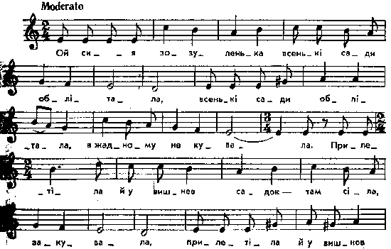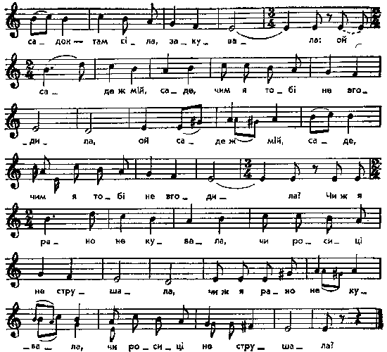 Ой сивая зозуленька всенькі сади облітала, всенькі сади облітала, в жадному не кувала. Прилетіла й у вишнев садок – там сіла, закувала: (2) – Ой саде ж мій, саде, чим я тобі не вгодила? (2) Чи ж я рано не кувала, чи росиці не струшала? Чи ж я рано не вставала, чи росиці не струшала? Молоденька Мар’юся всенькі двори обходила, всенькі двори обходила, в жадному не плакала. А як прийшла під батьків двір, там стала, заплакала. (2) – Ой дворе ж мій, дворе, чим я тобі не вгодила? (2) Чи ж я рано не вставала, чи я тебе не замітала? (2) Варіанти мелодії: Kolberg. Wolyn, № 36, 47, 48, 124, 127; текст: Lozinski, s. 30. Місце запису : Колодяжне Ковельського повіту Примітки Джерело : Леся Українка. Зібрання творів у 12 тт. – К. : Наукова думка, 1977 р., т. 9, с. 249 – 250. Вперше опубліковано : Народні мелодії. З голосу Лесі Українки. Записав і упорядкував Климент Квітка. – К. : 1917 р., ч. 1, с. 73 – 74. Співають дружки біля воріт молодої, повертаючись додому після запрошення гостей на весілля. Фольклорні записи Перший | Попередній | Перелік | Наступний | Останній |