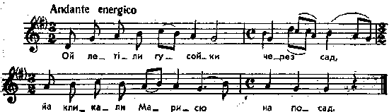 Ой летіли гусойки через сад, йа кликали Марисю на посад. Пор. з № 56 сього збірника; Kolberg. Wolyn, № 64, 71, 105, 101, 106; Kolberg. Pokucie, № 109, 157, 181, 192; Роздольський, № 68 – 79. Тексти: Wojcicki, t. 2, s. 150; Головацкий, т. 3, ч, 2, ст. 212, 335, 355; Waclaw z Oleska, s. 30, № 97. Місце запису : Колодяжне Ковельського повіту Примітки Джерело : Леся Українка. Зібрання творів у 12 тт. – К. : Наукова думка, 1977 р., т. 9, с. 253. Вперше опубліковано : Народні мелодії. З голосу Лесі Українки. Записав і упорядкував Климент Квітка. – К. : 1917 р., ч. 1, с. 75. Піснею запрошують молоду на посад. Фольклорні записи Перший | Попередній | Перелік | Наступний | Останній |