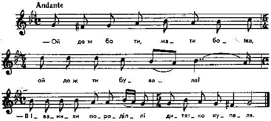– Ой де ж бо ти, мати божа, ой де ж ти бувала? – В Іванихи-породіллі дитятко купала. – Ой де ж бо ти, мати божа, ой де ж ти бувала? – В Іванихи-породіллі дитя колихала. Місце запису : Миропілля Звягельського повіту Примітки Джерело : Леся Українка. Зібрання творів у 12 тт. – К. : Наукова думка, 1977 р., т. 9, с. 255. Вперше опубліковано : Народні мелодії. З голосу Лесі Українки. Записав і упорядкував Климент Квітка. – К. : 1917 р., ч. 1, с. 76. Фольклорні записи Перший | Попередній | Перелік | Наступний | Останній |