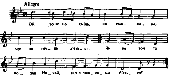 Ой то ж не хміль, не хмелина, що на тички в’ється. Чи не той то козак Нечай, що з ляшками б’ється? Зближені мелодії: Lipinski, № 159 (передрукована у Коціпінський, № 90); Коціпінський, № 61 (Про Саву Чалого); Рубец100, № 89 (Про Саву Чалого), № 27 (про Нечая). Інші мелодії пісні про Нечая: Лисенко, III, № 2; IV, № 1; Сокальский, № 25; Роздольський, № 612 і 971. Тексти: Антонович і Драгоманов. Исторические песни малорусского народа. К., 1874 г., т. II, № 12; В. Доманицький. Песни о Нечае. – «Киевская старина», 1905 г., № 1, 66 – 88; Zegota-Pauli, t. 1, s. 141 – 148; Сборник материалов для описания местностей и племен Кавказа, вып. 4, № 8, ст. 80. Місце запису : Любомль Примітки Джерело : Леся Українка. Зібрання творів у 12 тт. – К. : Наукова думка, 1977 р., т. 9, с. 258. Вперше опубліковано : Народні мелодії. З голосу Лесі Українки. Записав і упорядкував Климент Квітка. – К. : 1917 р., ч. 1, с. 78. Фольклорні записи Перший | Попередній | Перелік | Наступний | Останній |