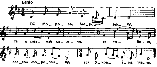 Ой Moрозе, Морозенку, та ти славний козаче, за тобою, славен Морозенку, вся Україна плаче. Варіанти мелодії: Рубец216, № 62 (= Рубец100, № 8), № 63 і 64; Колесса. Ходовичі, с. 136 (до інших слів); Колесса. Дума, т. 2, № 2; Линeва, № 4; Роздольський, № 775 – 778 (про Морозенка), 429 – 434, 437, 1003 – 1007 (до інших слів); О. Ніжанківський. Укр.-р. співаник. Львів, 1907; Лисенко. 2-й дес. хор. пісень, № 2; 11-й дес., № 1, і Лисенко. Шкільна збірка, с. 41; Записи Ф. Колесси і Нижанківського різняться межи собою, хоча зроблені зо співу тої самої особи. Геть інші мелодії: Коціпінський, № 91; М. Сперанский. Южнорусская песня и современные ее носители. По поводу бандуриста Т. Пархоменка. – Сборник Нежинского ист.-филолог. общества, т. V, ст. 179 (новоутворена, див. ст. 137 – 139 розвідки Сперанського). Тексти: Лукашевич, т. 1, с. 28; Мордовцев, № 9, с. 193; Гринченко, т. 2, № 1418; Довнар-Запольский, с. 440; Эварницкий, № 724 (у Грінченка і Яворницького показані паралелі з інших видань); Гнедич, № 768. Місце запису : Любомль Примітки Джерело : Леся Українка. Зібрання творів у 12 тт. – К. : Наукова думка, 1977 р., т. 9, с. 259. Вперше опубліковано : Народні мелодії. З голосу Лесі Українки. Записав і упорядкував Климент Квітка. – К. : 1917 р., ч. 1, с. 78. В рукописному зошиті (стор. 32 – 33) пісня повністю записана рукою сестри Лесі Українки Ольги Кривинюк. Фольклорні записи Перший | Попередній | Перелік | Наступний | Останній |