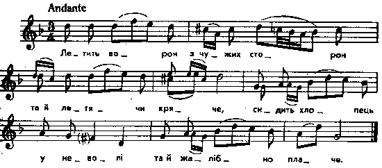 Летить ворон з чужих сторон та й летячи кряче, сидить хлопець у неволі та й жалібно плаче. Сидить хлопець у неволі, сорочку латає, крізь ришотку поглядає, – десь родину має. - Ой маю я родиноньку далеко од мене, – ой чую я через люди – зрікається мене. Ой ти, моя родинонько, не зрікайся мене, продай воли, продай коні та й викуп же мене! – Ой жаль мені, мій синоньку, худоби збувати, як заробив, як заслужив, так мусиш 'дбувати. Ой на воді два лебеді, вони вбадва б’ються. Десь на мене, молодого, кайдани куються. Ой куйтеся, не куйтеся, я вас не боюся, прийде така час-година, сами розкуються. Стоїть явір над водою, на воду схилився... Ой вже ж бо я, молоденький, од роду одбився. Ой одбився, моя мати, ой одбився, татку, дали мені сіру свиту й сумашедшу шапку. Дали ж мені сіру свиту – то мушу носити... Дали шапку сумашедшу – гірко мні тут жити! Пісня стоїть у генетичному зв’язку з попередньою, через те уміщена в сім розділі. Місце запису : Колодяжне Примітки Джерело : Леся Українка. Зібрання творів у 12 тт. – К. : Наукова думка, 1977 р., т. 9, с. 261 – 262. Вперше опубліковано : Народні мелодії. З голосу Лесі Українки. Записав і упорядкував Климент Квітка. – К. : 1917 р., ч. 1, с. 80 – 81. Фольклорні записи Перший | Попередній | Перелік | Наступний | Останній |